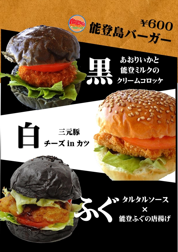 能登島産食材を使ったご当地バーガー。黒はイカ墨を使い、アオリイカのクリームコロッケ、白は能登島の三元豚とんかつをサンドしている。